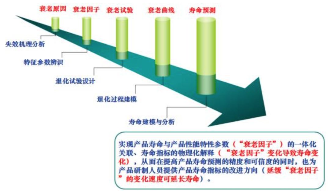 即从产品失效机理分析入手,查找产品衰老原因;然后通过特征参数辨识,找到表征产品衰老症兆的衰老因子;进而设计相应的性能退化试验或者加速性能退化试验,获取性能退化数据;再利用退化过程建模技术建立符合产品特点的衰老曲线;在性能退化模型的基础上,建立产品的寿命分布模型。
